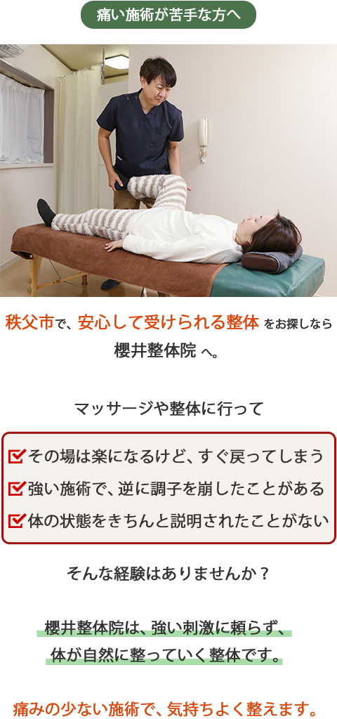 強く押したり無理に動かしたりすることなく、身体の状態を見極めながら必要なポイントだけを整えていくため「整体は痛そうで不安」という方でも安心して受けていただけます。
